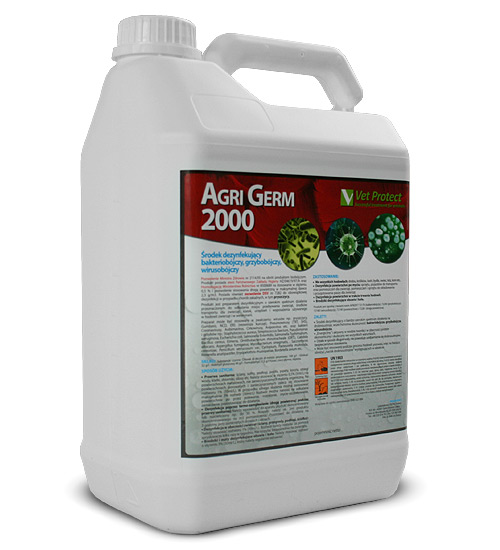 Agri Germ 2000 jest preparatem dezynfekcyjnym o szerokim spektrum działania przeznaczonym do odkażania miejsc przebywania zwierząt, środków transportu dla zwierząt, klatek, urządzeń i wyposażenia używanego w hodowli zwierząt i w weterynarii. To środek dezynfekcyjny o bardzo szerokim spektrum działania: bakteriobójczo, grzybobójczo, wirusobójczo. Szybko działajacy i aktywny w wodzie twardej i w obecności protein: ekonomiczny i skuteczny we wszystkich warunkach. Działa w sposób długotrwały, nie powoduje uodparniania się drobnoustrojów gwarantując bezpieczeństwo stosowania.