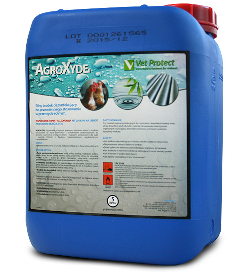 AgroXyde II jest bardzo silnym środkiem dezynfekującym do stosowania w przemyśle rolnym. Z powodzeniem można stosować AgroXyde przy hodowli ptaków i zwierząt do czyszczenia i dezynfekcji instalacji wody pitnej, dezynfekcji wody dla ludzi i zwierząt, do usuwania zanieczyszczeń organicznych z rurociągów, zbiorników wody, fontanny, rynnowych systemów dystrybucji wody itp.