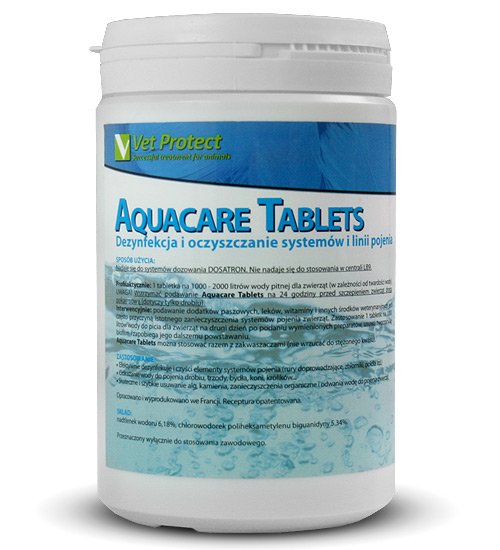 Aquacare Tablets posiada silne własności utleniające, które w połączeniu z trwałą zdolnością bakteriobójczą pozwalają na szybkie oczyszczenie wody do pojenia, chroniąc w ten sposób zdrowie zwierząt. Tak wszechstronne działanie powoduje, że przewody linii pojenia, urządzeń dozujących i poideł zostaną oczyszczone z alg, kamienia wapiennego i materii organicznej - które stanowią źródło zakażenia wody. Regularne stosowanie Aquacare Tablets zmniejsza wydzielanie amoniaku i związków siarki, przez co poprawia zapach w pomieszczeniach hodowlanych.
