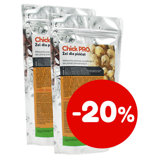 Chick Pro Żel to specjalistyczna mieszanka paszowa uzupełniająca dla piskląt jednodniowych wszystkich gatunków drobiu. Jest innowacyjnym pomysłem na dostarczenie w pierwszym karmieniu wszystkiego co niezbędne do przeżycia i akomodacji w nowym środowisku (elektrolity, energia, ochrona, zasiedlenie).