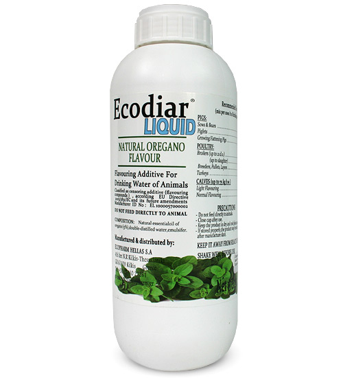 Ecodiar Liquid to preparat w 100% ziołowy, zawiera wyłącznie ekstrakty roślinne. Wykazuje wysoką skuteczność przy zapobieganiu i zwalczaniu biegunki. Wykazuje silne działanie bakteriobójcze. Kompozycja ekstraktów ziołowych skutecznie pobudza apetyt oraz stymuluje wzrost i wykorzystanie paszy. Systematyczne stosowanie podczas tuczu ogranicza pojawianie się chorób przewodu pokarmowego. Preparat dostępny jest z certyfikatem dla produkcji ekologicznej.