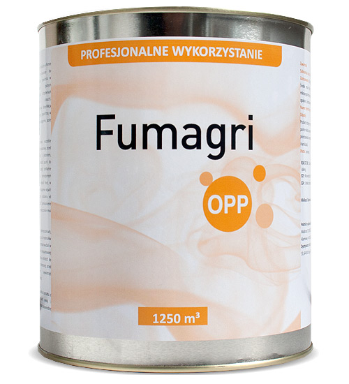 Fumagri 1250 m3 to preparat bakterio i grzybobójczy w postaci odkażającego proszku do dezynfekcji pustych pomieszczeń inwentarskich (kurniki, obory), silosów paszowych, wylęgarniach i środkach transportu (zwierząt, artykułów spożywczych, pasz).