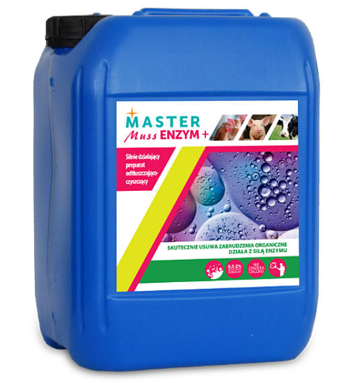 Master Muss Enzym + to alkaliczny środek odtłuszczająco - czyszczący o zaawansowanej formule najwyższej skuteczności usuwania materii organicznej. Unikalny skład został dobrany z myślą o szybkim usuwaniu najbardziej uporczywych zabrudzeń w budynkach inwentarskich, w których prowadzona jest działalność rolno-spożywcza lub hodowlana.