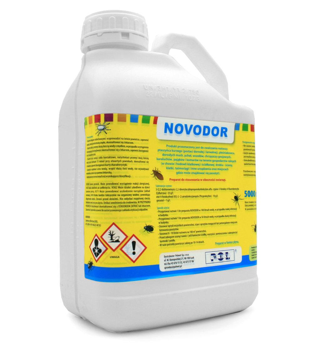 Novodor jest przeznaczony do zwalczania roztoczy, ptaszyńca kurzego (larwy i dorosłego osobnika) i pleśniakowca, dorosłych much, pcheł, wszołów, chrząszczy gnojowych, karaluchów, pająków i komarów w pomieszczeniach na terenie gospodarstw rolnych (chowie i hodowli klatkowej i ściółkowej drobiu – ściany, klatki, taśmociągi, inne urządzenia oraz miejsca gdzie może znajdować się pasożyt. Nr pozwolenia na obrót produktem biobójczym: 7814/19