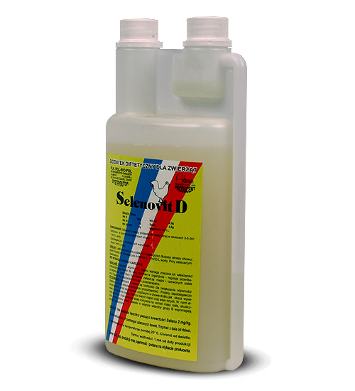 1 litr preparatu Selenovit D zawiera: Witamina E 120 g; Witamina B1 1 g; Witamina B5 0,5 g; Witamina PP 2 g; Selen 2,2 g.