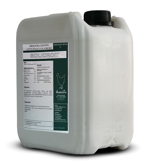 Solicroit 5l to płynny białkowo-ziołowy stymulator wzrostu dla drobiu. Polecany szczególnie hodowcom, u których występują problemy z twardą wodą i trudności w rozpuszczaniu preparatów sypkich.