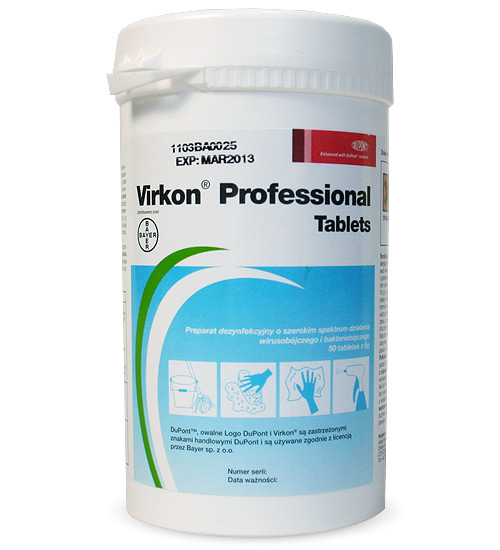 Virkon Professional Tablets to nowa postać preparatu do dezynfekcji w formie tabletek o masie 5 gram pozwala na dokładne odmierzenie ilości preparatu dezynfekcyjnego bez konieczności stosowania miarek. Niszczy bakterie i wirusy wrażliwe na kwaśne środowisko. Virkon Professional Tablets jest nie drażniącym preparatem, nie pozostawia plam i jest biodegradowalny. Można go stosować do dezynfekcjo środków transportu, jaj wylęgowych i wody przeznaczonej dla drobiu. Dostępny jest w bardzo ekonomicznych opakowaniach po 50 tabletek.