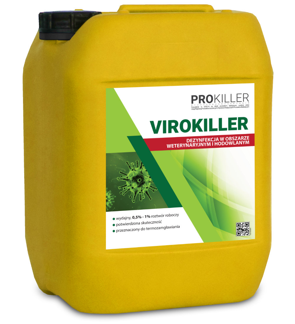 VIROKILLER - płyn do dezynfekcji w przemyśle spożywczym, rolnictwie i weterynarii. Przeznaczony do dezynfekcji pomieszczeń, powierzchni, środków transportu, miejsc przebywania zwierząt, klatek, urządzeń i wyposażenia używanego w hodowli zwierząt w celu utrzymania higieny, o działaniu bakteriobójczym i grzybobójczym. Może być stosowany na powierzchniach kontaktujących i nie kontaktujących się z żywnością.