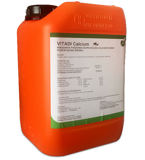 1 litr preparatu VITADI Calcium zawiera w 1kg: Witamina D3 200.000 I.U.; Witamina E 28 000 I.U; Wapń 10%, manganu chlorek czterowodny 14 400mg