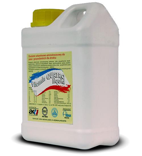 1 litr preparatu Vitamin Quatro zawiera: Witamina A 100 mln I.U.; Witamina D3 2 mln I.U.; Witamina E 8 g; Witamina K3 0,9 g; Witamina C 8 g; Witamina H 20 mg; Witamina B1 1,5 g; Witamina B2 0,8 g; Witamina B3 4,5 g; Witamina B5 2,5 mg; Witamina B6 1,6 g; Witamina B12 2,5 mg; Kwas glutaminowy 11,4 g; Kwas asparaginowy 6,7 g; Glicyna + Seryna 6,6 g; Alanina 6,2 g; Lizyna 5,6 g; Leucyna 5,3 g; Walina 4,2 g; Izoleucyna 3,9 g; Arginina 3,6 g; Treonina 3 g; Prolina 2,8 g; Fenyloalanina 2,6 g; Tyrozyna 1,7 g; Histydyna 1,5 g; Metionina 1 g; Tryptofan 0,9 g; Cystyna 0,65 g; Woda demineralizowana do 1000 ml.