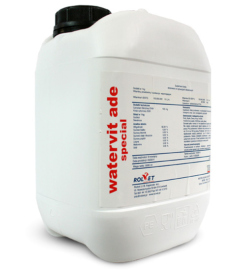 1 litr preparatu WaterVit ADE Special zawiera: Witamina A 100 000 000 I.U.; Witamina D3 200 000 I.U.; Witamina E 20 tys. I.U.; Nośnik do 1000 ml.
