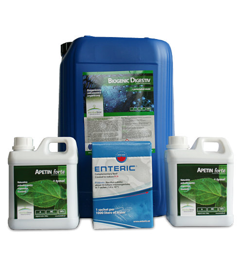1,2,3 dzień – łącznie - Apetin Forte -150-200ml/1000l oraz Biogenic Digestive – 300-500 ml/1000l wody do picia